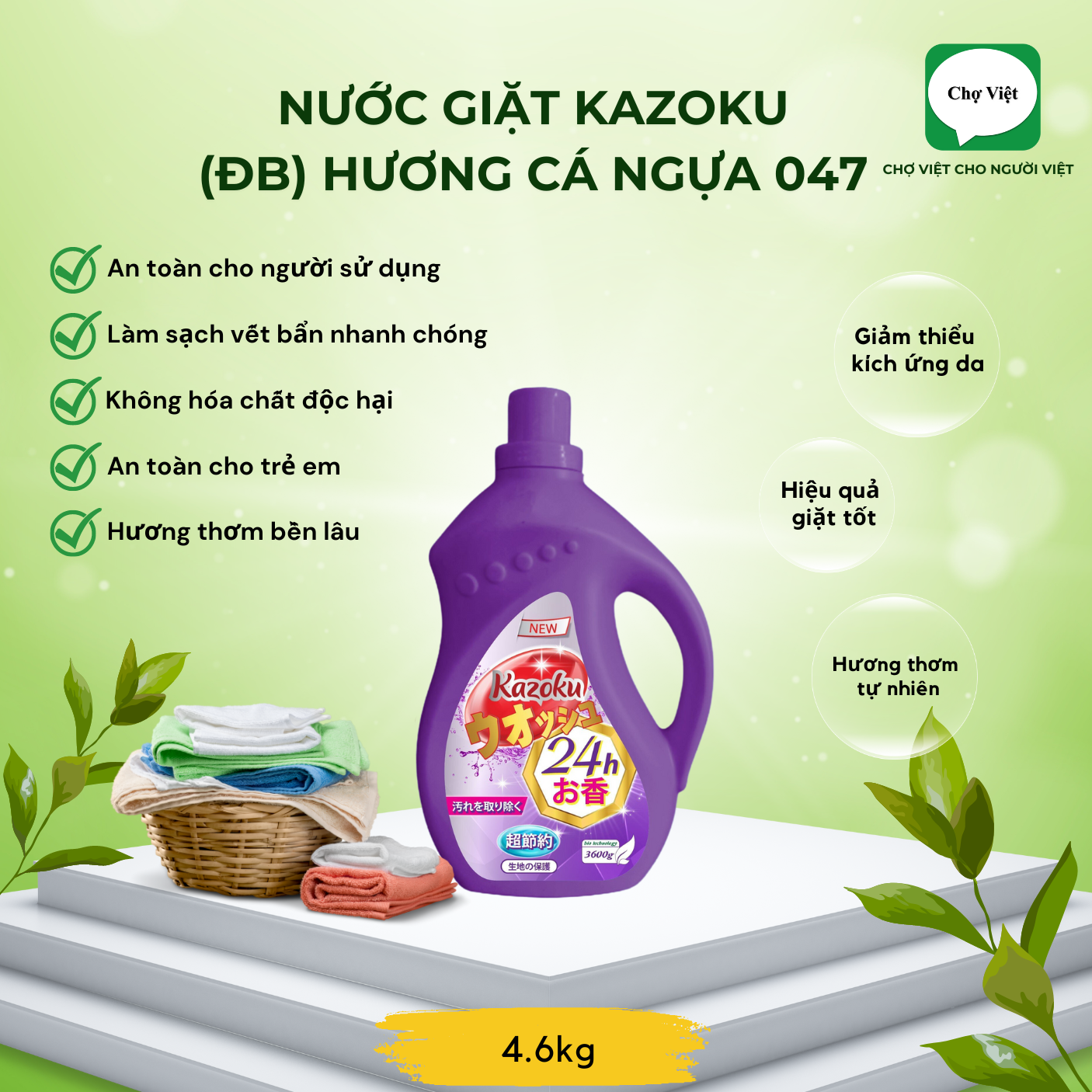 Nước giặt khác có thể làm sạch quần áo bằng chất tẩy, hiệu quả rất nhanh nhưng về lâu dài sẽ làm hỏng sợi vải. Nước giặt cao cấp Kazoku – Chợ Việt ATZ sử dụng chất hoạt động bề mặt để làm sạch quần áo, mang lại hiệu quả làm sạch tức thì, không tốn công sức.